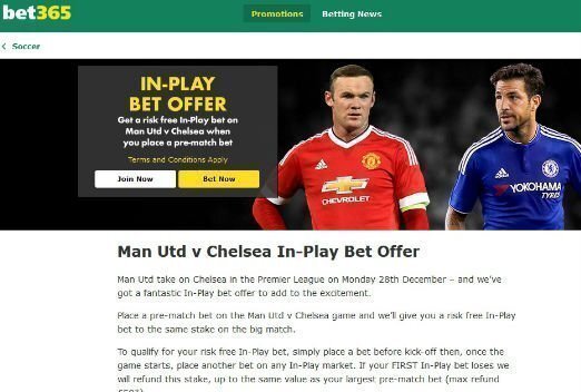 Bet365 are offering another £50 risk free in-play bet to all customers (both new and existing). In order to qualify place a bet before Manchester United vs Chelsea kicks off at 5:30pm, then place another bet on any in-play betting market. If you lose your first in-play bet Bet365 will refund this bet up to a maximum of £50. Therefore effectively giving you a risk free in-play bet to use on the game. Click here to be taken to Bet365 and earn your £50 risk free in play bet.